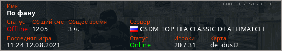 Играет на Counter Strike 1.6 сервере. Страна: РоссияПервый раз замечен 19:28 10.08.2021