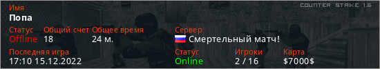 Играет на Counter Strike 1.6 сервере. Страна: РоссияПервый раз замечен 16:49 15.12.2022