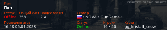 Играет на Counter Strike Source сервере. Страна: РоссияПервый раз замечен 15:36 23.09.2022