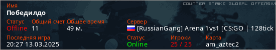 Играет на Counter Strike Global Offensive сервере. Страна: РоссияПервый раз замечен 11:16 25.02.2025