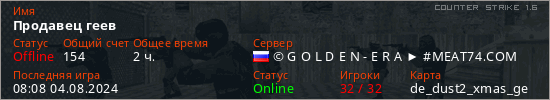 Играет на Counter Strike 1.6 сервере. Страна: РоссияПервый раз замечен 06:59 11.02.2023