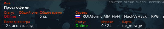 Играет на Counter Strike Global Offensive сервере. Страна: РоссияПервый раз замечен 21:04 11.03.2026