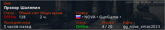 Играет на Counter Strike Source сервере. Страна: РоссияПервый раз замечен 19:05 12.12.2025