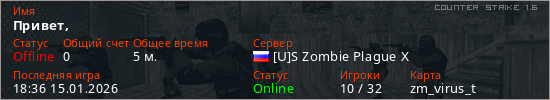 Играет на Counter Strike 1.6 сервере. Страна: РоссияПервый раз замечен 18:17 15.01.2026