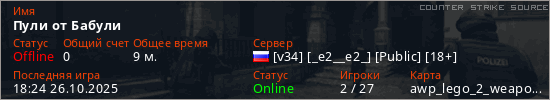 Играет на Counter Strike Source сервере. Страна: РоссияПервый раз замечен 17:17 18.11.2024