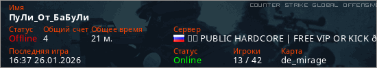 Играет на Counter Strike Global Offensive сервере. Страна: РоссияПервый раз замечен 11:43 26.01.2025