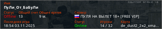 Последний раз был в сети 18:54 03.11.2025 Игрок с таким ником замечен на 51 сервере