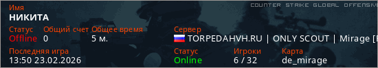 Играет на Counter Strike Global Offensive сервере. Страна: РоссияПервый раз замечен 13:36 23.02.2026