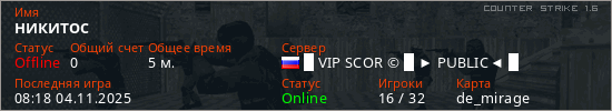 Играет на Counter Strike 1.6 сервере. Страна: РоссияПервый раз замечен 08:08 04.11.2025