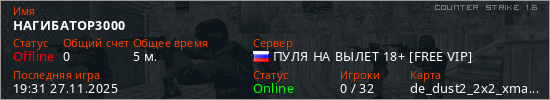 Играет на Counter Strike 1.6 сервере. Страна: РоссияПервый раз замечен 19:17 27.11.2025