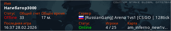 Играет на Counter Strike Global Offensive сервере. Страна: РоссияПервый раз замечен 11:05 22.02.2026