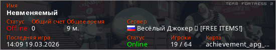 Играет на Team Fortress 2 сервере. Страна: РоссияПервый раз замечен 12:31 15.03.2026