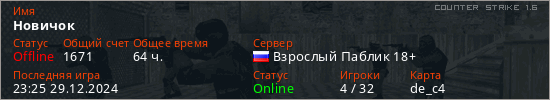 Играет на Counter Strike 1.6 сервере. Страна: РоссияПервый раз замечен 10:36 20.02.2020