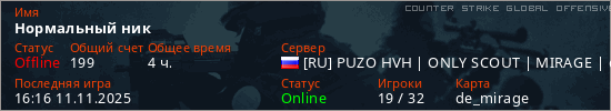 Играет на Counter Strike Global Offensive сервере. Страна: РоссияПервый раз замечен 15:47 07.08.2025