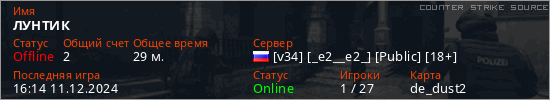 Играет на Counter Strike Source сервере. Страна: РоссияПервый раз замечен 22:09 16.12.2023