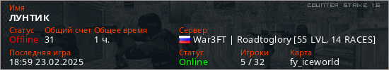 Играет на Counter Strike 1.6 сервере. Страна: РоссияПервый раз замечен 17:05 17.12.2022
