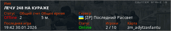 Играет на Counter Strike 1.6 сервере. Страна: УкраинаПервый раз замечен 19:38 30.01.2026