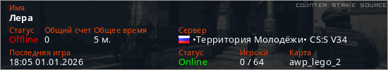 Играет на Counter Strike Source сервере. Страна: РоссияПервый раз замечен 17:42 01.01.2026