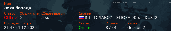 Играет на Counter Strike Global Offensive сервере. Страна: РоссияПервый раз замечен 21:45 21.12.2025