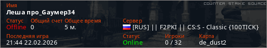 Играет на Counter Strike Source сервере. Страна: РоссияПервый раз замечен 21:29 22.02.2026