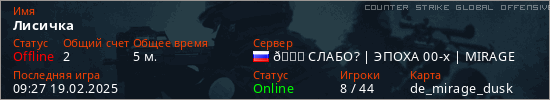 Играет на Counter Strike Global Offensive сервере. Страна: РоссияПервый раз замечен 08:58 19.02.2025