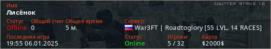 Играет на Counter Strike 1.6 сервере. Страна: РоссияПервый раз замечен 19:52 06.01.2025