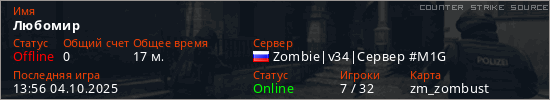 Играет на Counter Strike Source сервере. Страна: РоссияПервый раз замечен 13:58 25.09.2025