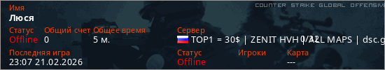Играет на Counter Strike Global Offensive сервере. Страна: РоссияПервый раз замечен 22:40 21.02.2026