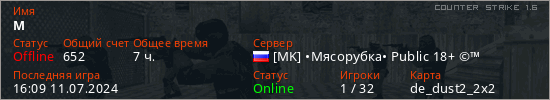 Играет на Counter Strike 1.6 сервере. Страна: РоссияПервый раз замечен 18:59 16.01.2024