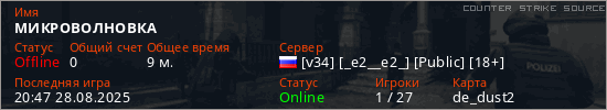 Играет на Counter Strike Source сервере. Страна: РоссияПервый раз замечен 01:02 13.10.2023