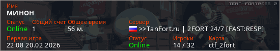 Играет на Team Fortress 2 сервере. Страна: РоссияПервый раз замечен 22:08 20.02.2026