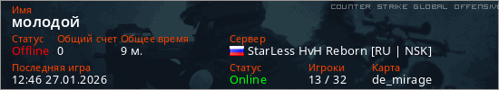 Играет на Counter Strike Global Offensive сервере. Страна: РоссияПервый раз замечен 23:27 19.01.2026