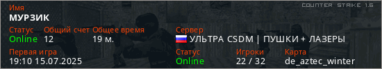 Играет на Counter Strike 1.6 сервере. Страна: РоссияПервый раз замечен 19:10 15.07.2025