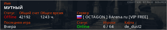 Играет на Counter Strike Source сервере. Страна: РоссияПервый раз замечен 12:19 21.12.2019