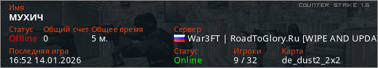 Играет на Counter Strike 1.6 сервере. Страна: РоссияПервый раз замечен 16:50 14.01.2026