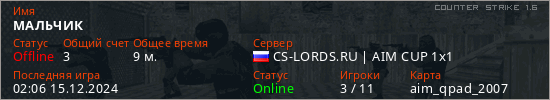 Играет на Counter Strike 1.6 сервере. Страна: РоссияПервый раз замечен 01:46 15.12.2024