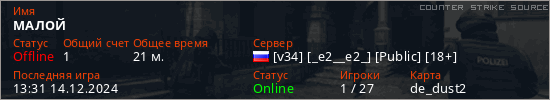 Играет на Counter Strike Source сервере. Страна: РоссияПервый раз замечен 11:10 08.10.2023