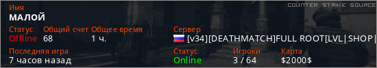 Играет на Counter Strike Source сервере. Страна: РоссияПервый раз замечен 21:40 08.05.2024
