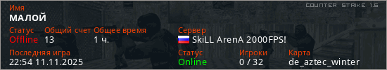 Играет на Counter Strike 1.6 сервере. Страна: РоссияПервый раз замечен 13:57 01.08.2022
