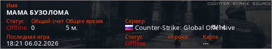 Играет на Counter Strike Source сервере. Страна: РоссияПервый раз замечен 17:52 06.02.2026