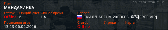 Играет на Counter Strike 1.6 сервере. Страна: РоссияПервый раз замечен 15:03 19.01.2026