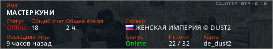 Играет на Counter Strike 1.6 сервере. Страна: РоссияПервый раз замечен 03:11 26.01.2026