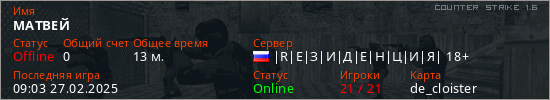 Играет на Counter Strike 1.6 сервере. Страна: РоссияПервый раз замечен 12:31 08.04.2023