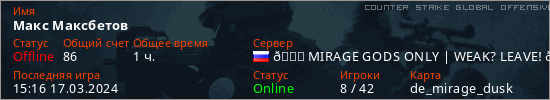 Играет на Counter Strike Global Offensive сервере. Страна: РоссияПервый раз замечен 21:08 19.02.2024