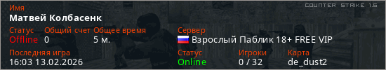 Играет на Counter Strike 1.6 сервере. Страна: РоссияПервый раз замечен 15:59 13.02.2026