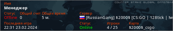 Играет на Counter Strike Global Offensive сервере. Страна: РоссияПервый раз замечен 22:19 23.02.2024