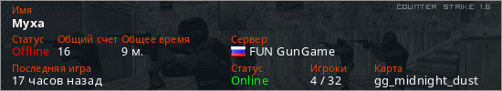 Играет на Counter Strike 1.6 сервере. Страна: РоссияПервый раз замечен 15:51 21.03.2026
