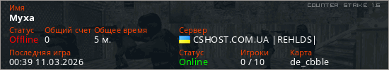 Играет на Counter Strike 1.6 сервере. Страна: УкраинаПервый раз замечен 22:49 10.03.2026