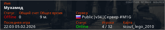 Играет на Counter Strike Source сервере. Страна: РоссияПервый раз замечен 21:08 05.02.2026