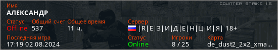 Последний раз был в сети 17:19 02.08.2024 Игрок с таким ником замечен на 17 серверах